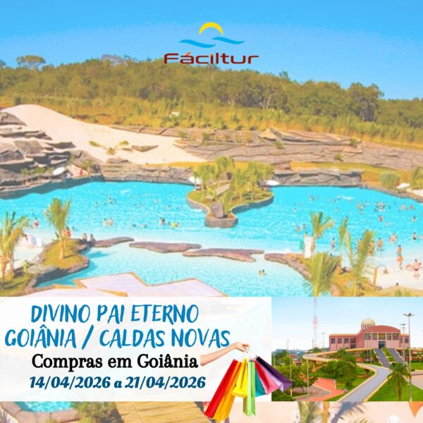 17/04/2026 – (sexta-feira) – Após café da manhã, saída para Goiania, capital de Goiás e importante centro de compras do centro Oeste. Após o almoço, saída para Caldas Novas, com chegada prevista para as 17:00. Hospedagem e noite livre.