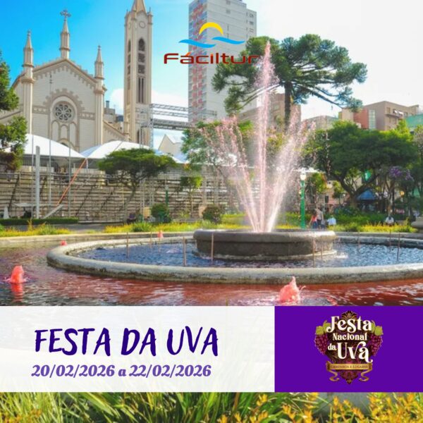 22/02/2026 – (Domingo) – Caxias do Sul – Após o café da manhã seguiremos ao Parque Nacional da Festa da Uva, que na edição de 2026 tem o tema “Fruto de um Sonho Imigrante”! Este tema celebra os 150 anos da imigração italiana no Rio Grande do Sul, os 135 anos de emancipação do município e os 95 anos da própria festa. A escolha do tema ressalta a importância da imigração na cultura, gastronomia e turismo da região, destacando a força e a identidade da Serra Gaúcha. Às 15:00h saída dos pavilhões para a rua Sinimbu onde acontece o tradicional desfile, com foco nas comunidades e interior e que contará a história desses imigrantes e toda a sua trajetória, das dificuldades ao êxito. Tudo isso com o aroma de uva no ar. Após o desfile, início do retorno.